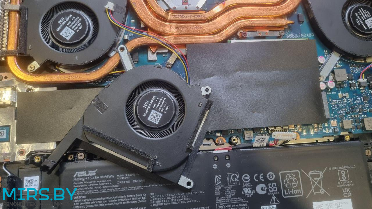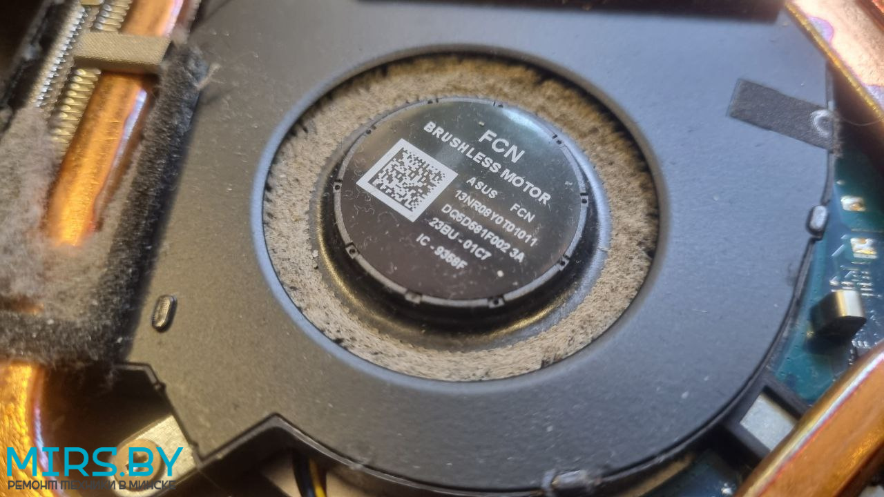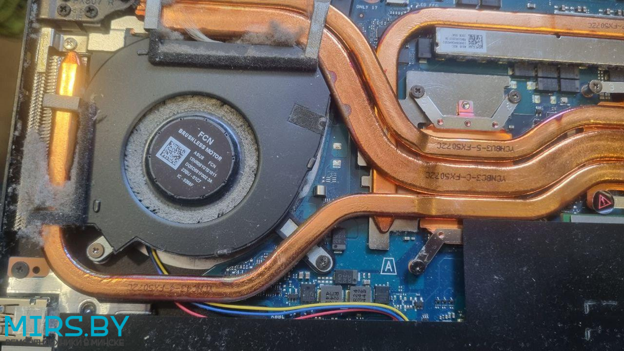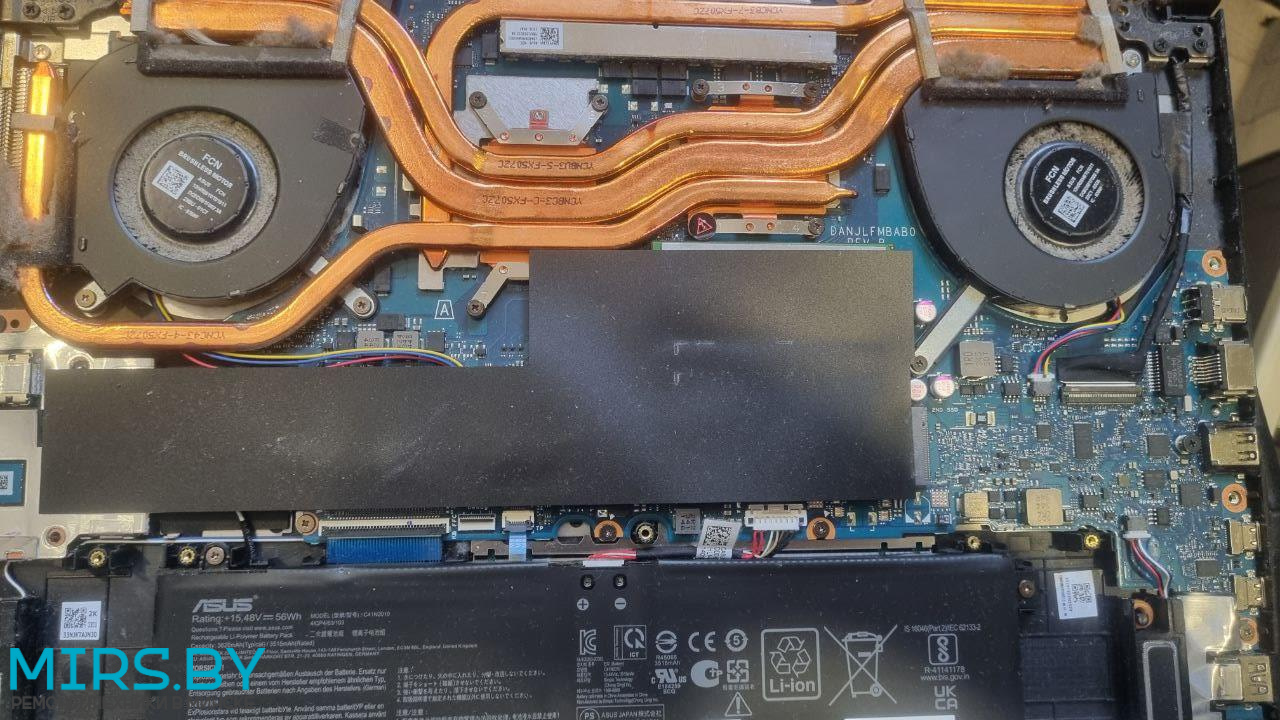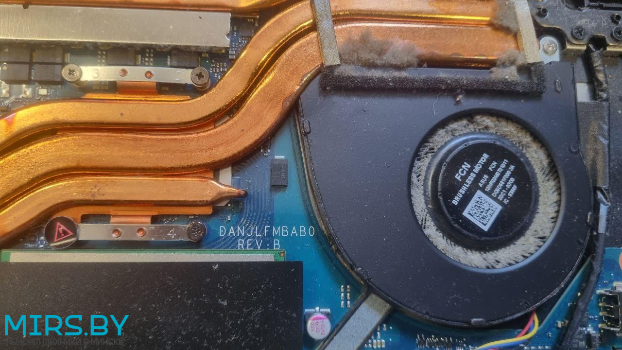 - Перегрев: ноутбук ASUS TUF Gaming F15 FX507Z тормозит, throttling, греется, зависает - решается чисткой от пыли с заменой термопасты, но в запущенных случаях могут быть проблемы и с процессором и с видеочипом, в нашем случае не выжил только один из двух вентиляторов.