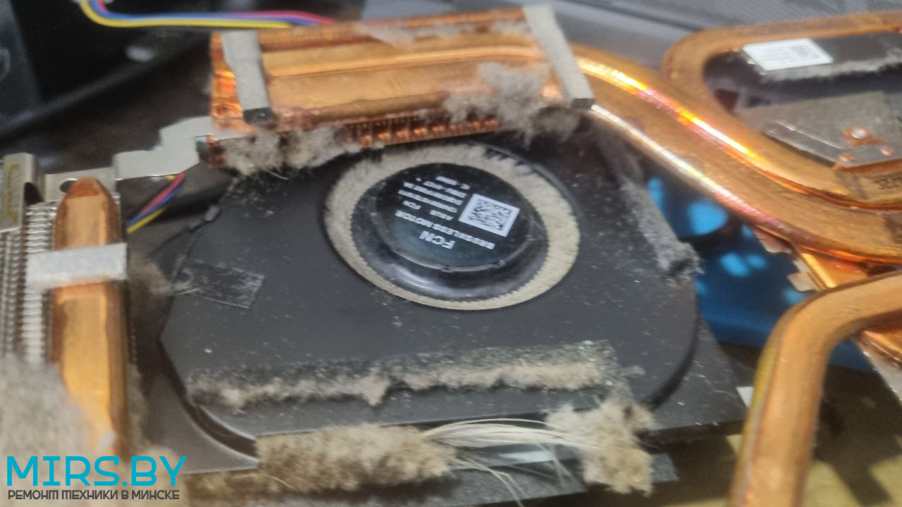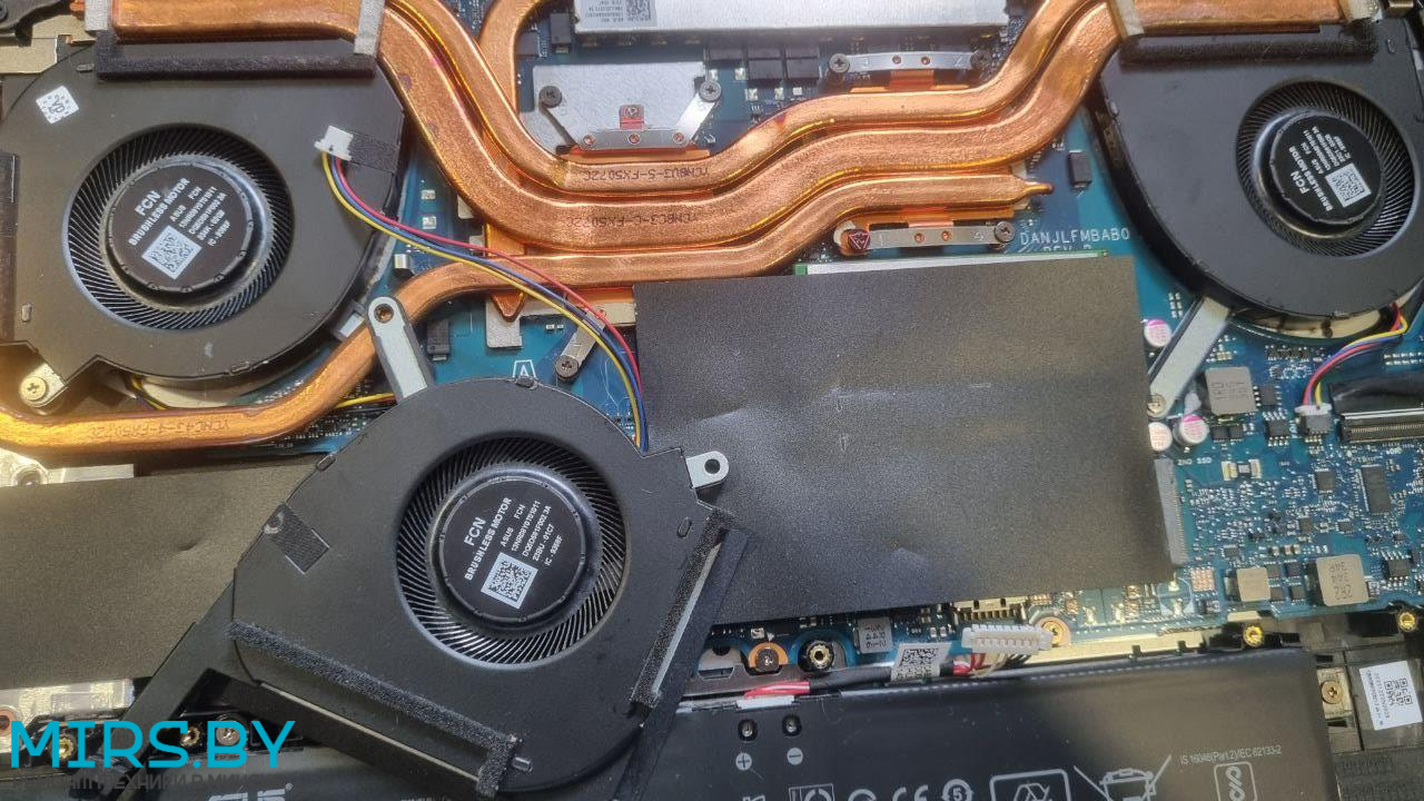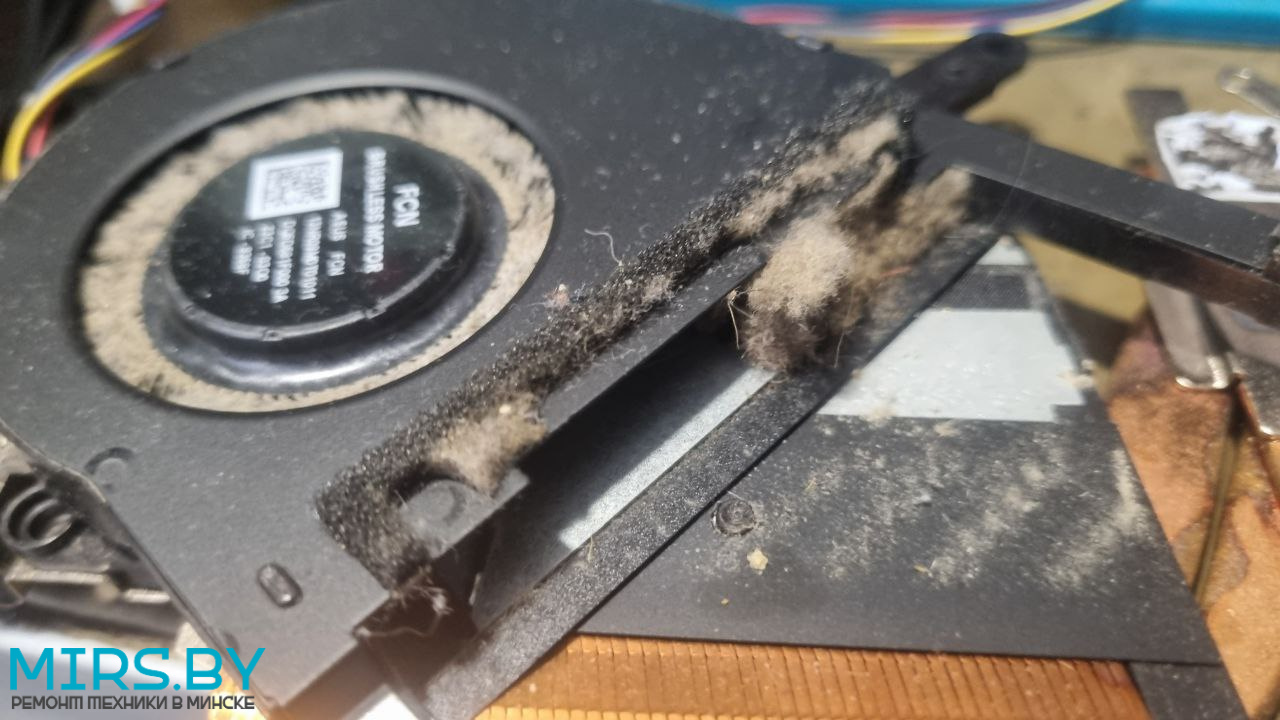 После разборки увидели ужасное состояние системы охлаждения ноутбука (смотрите фотографии, в кулере и радиаторах ноутбука были не только пыль, пылевые шубы, но и перья, высохла заводская термопаста как на процессоре, так и на графическом чипе). После чистки и замены термоинтерфейсов определили, что один и з кулеров (вентиляторов FCN cooler) вышел из строя (проблема с подшипником). Заменили кулер на новый оригинальный (не заказывайте ширпотреб на ОЗОН и Wildberries), протестировали под нагрузкой.