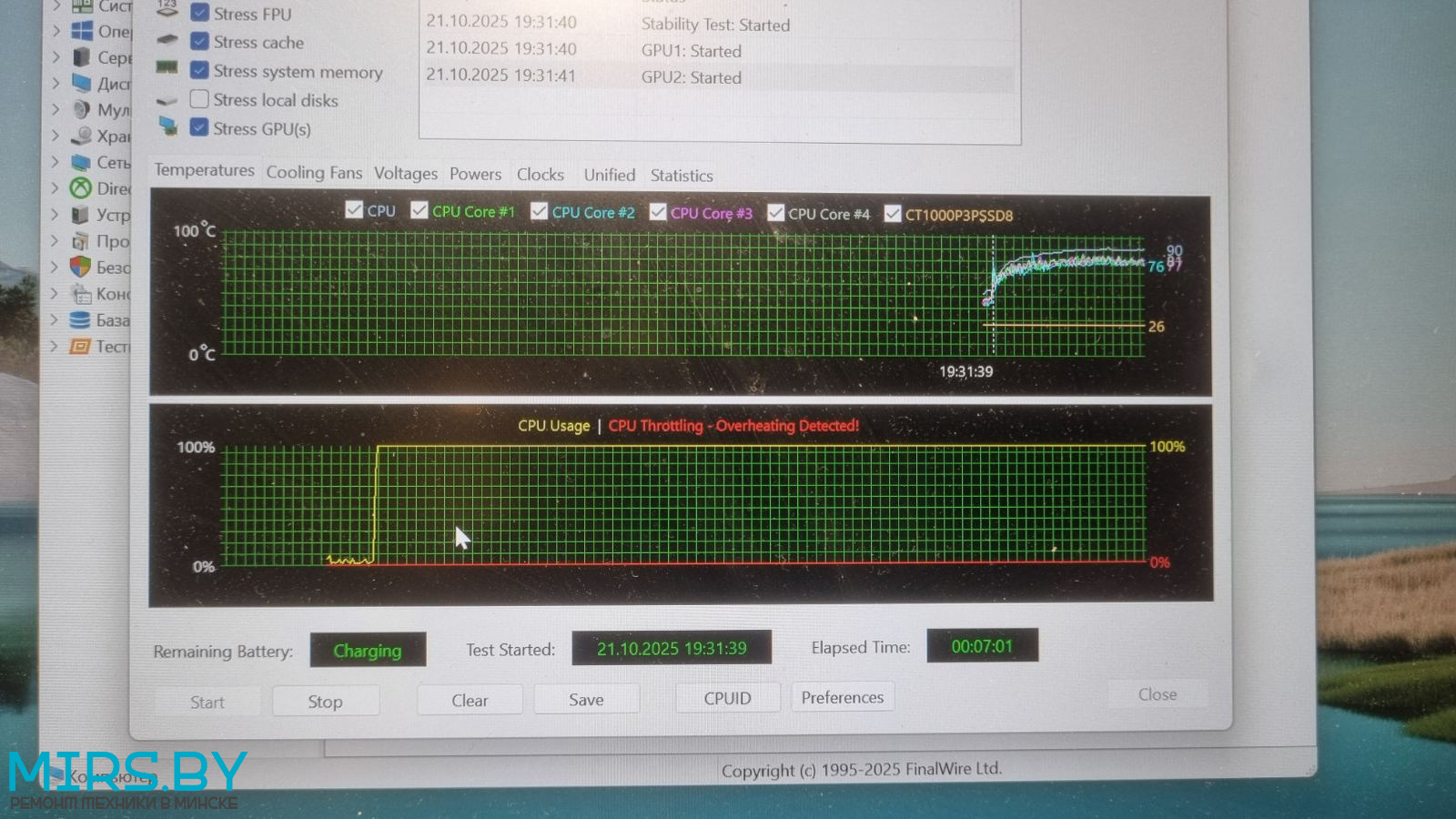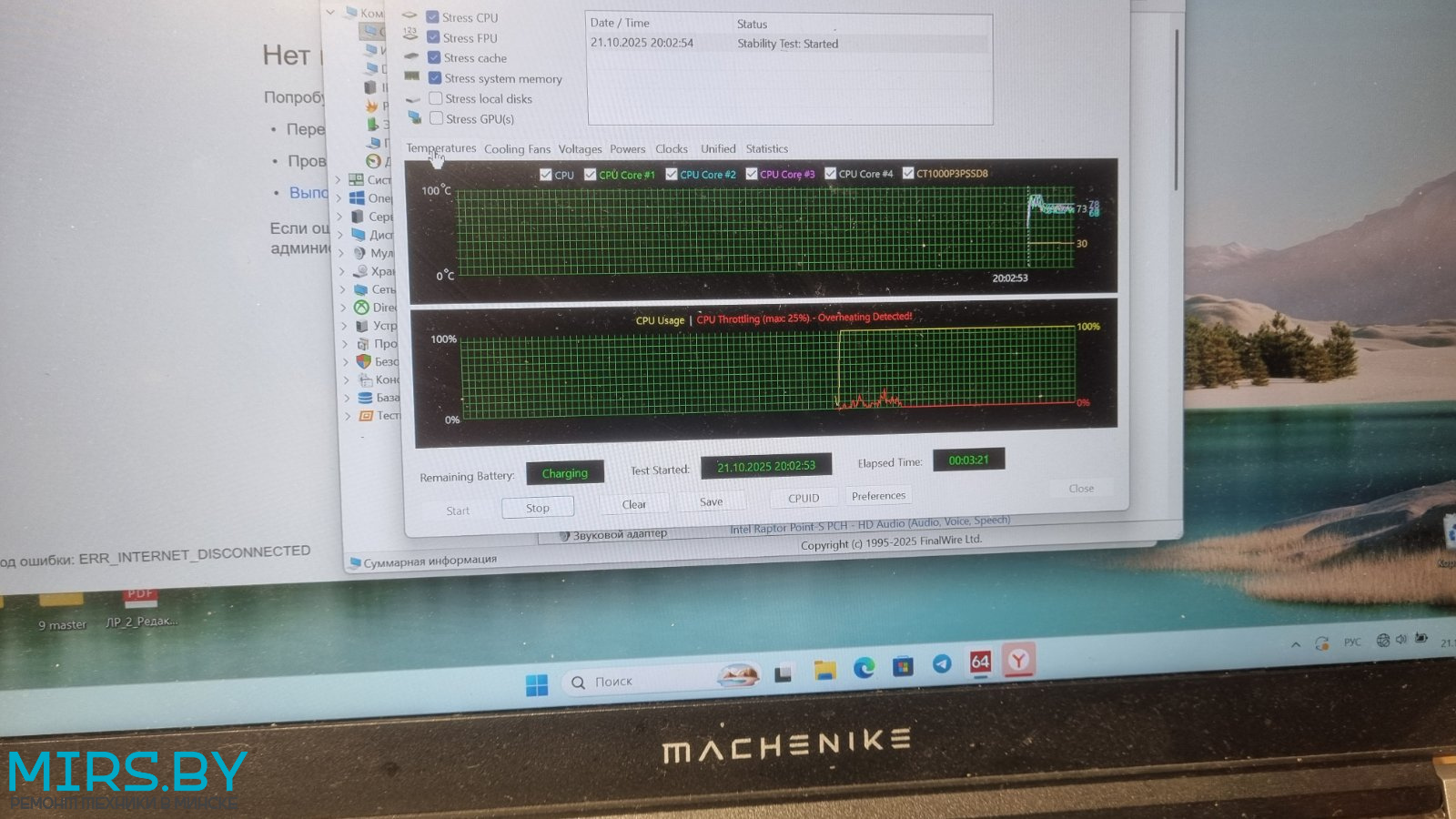 Клиент обратилась в мастерскую Мир Сервис с просьбой продиагностировать ноутбук, так как ноутбук Machenike сильно шумит и греется - в тестах throttling, перегревается. Разобрали почистили от пыли, заменили термопасту. Дали рекомендации по снижению напряжения, настройке работе кулеров в приложении Throttlestop (один из немногих чипов, который подвергается Undervolting в серии 13th Gen Intel.