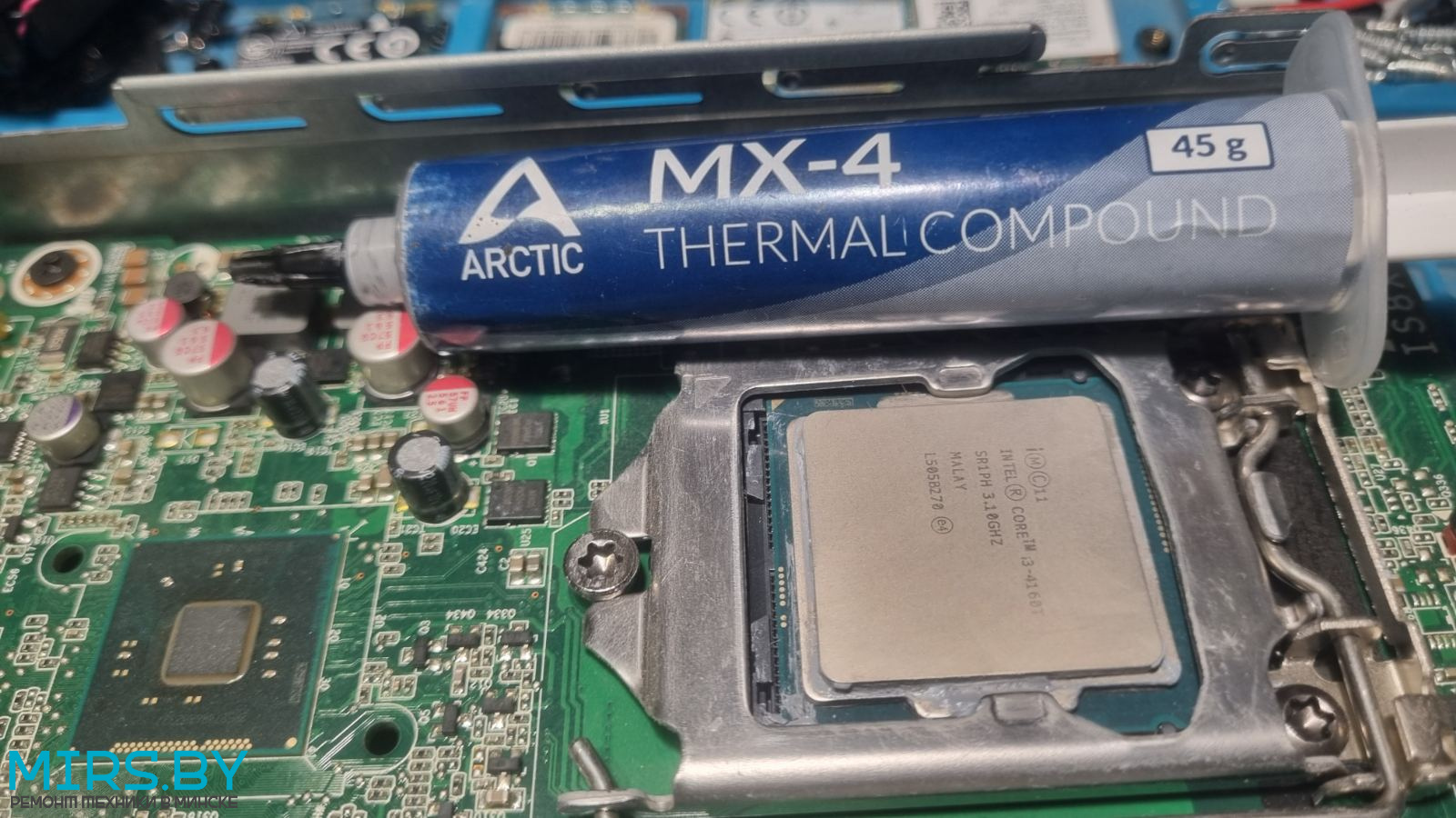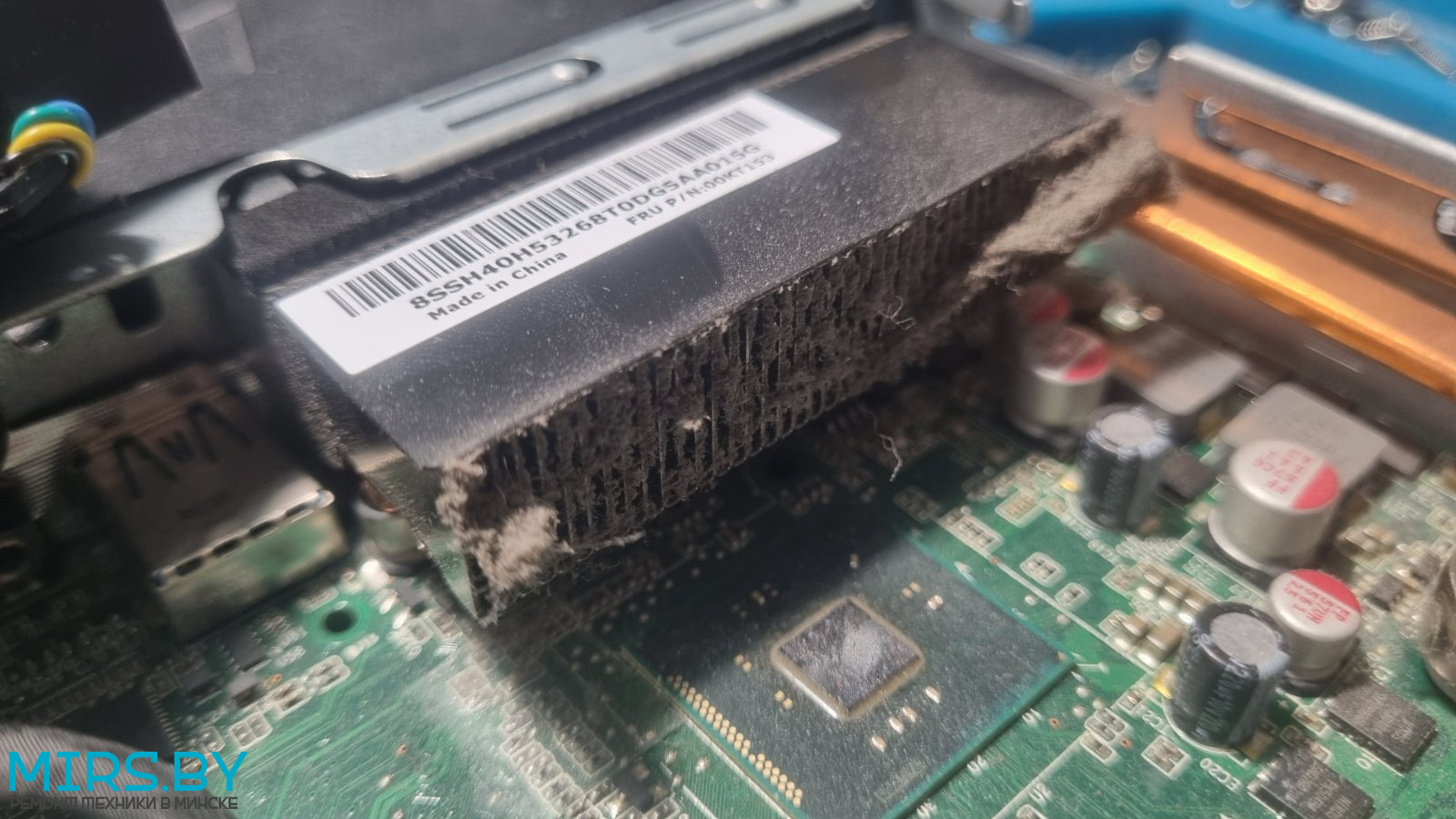 В данном случае мини компьютер Lenovo ThinkCentre M83 зависал с синим экраном, сильно шумел и самостоятельно и выключался. После разборки и проведения диагностики неисправности было определено, что с момента покупки мини компьютер никто не чистил, образовалась пылевая шуба, термопаста высохла. Просто почистили систему охлаждения Lenovo ThinkCentre M83, заменили термопасту, протестировали, а также добавили 1 планку оперативной памяти на 8 ГБ для более быстрой работы.
