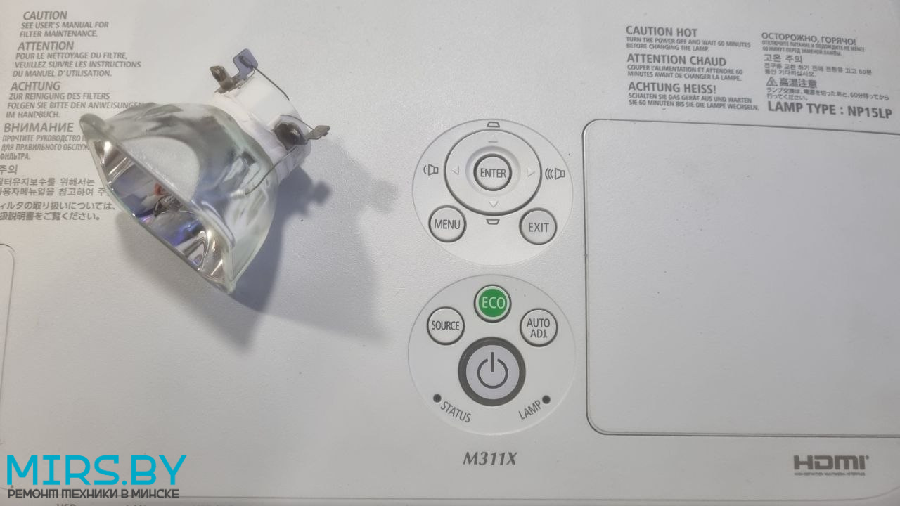 В конкретном случае, типовая проблема проектора NEC M311X, выход из строя лампы. Хотя это даже не поломка, про ресурс лампы истек. Осуществили замену лампы проектора NP15LP (Ushio NSHA NSH 230 Ватт) на оригинальную новую без корпуса, так как корпус лампы был цел.
